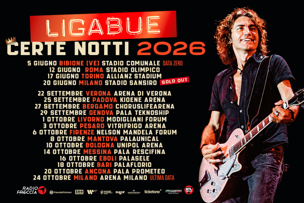 14 città e 14 appuntamenti unici che non prevederanno repliche per rendere ogni “notte” speciale e irripetibile; una grande festa che partirà il 22 settembre dall’Arena di Verona e che si concluderà il 24 ottobre all’Arena Milano, ultima data live di Ligabue per il 2026.